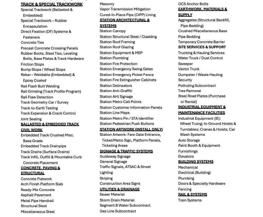 Sub-bid quotes from all interested bidders for work are requested for the following anticipated scopes, including - but not limited to - list below.